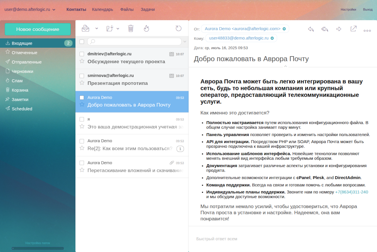Как один из вариантов установки, предлагается развертывание вместе с почтовым сервером Dovecot / Exim — в случае, если у вас нет своего почтового сервера. Если у вас есть почтовый сервер, Аврора может его использовать — но вы также можете установить версию, которая предлагает все необходимые серверные компоненты, за ту же стоимость.