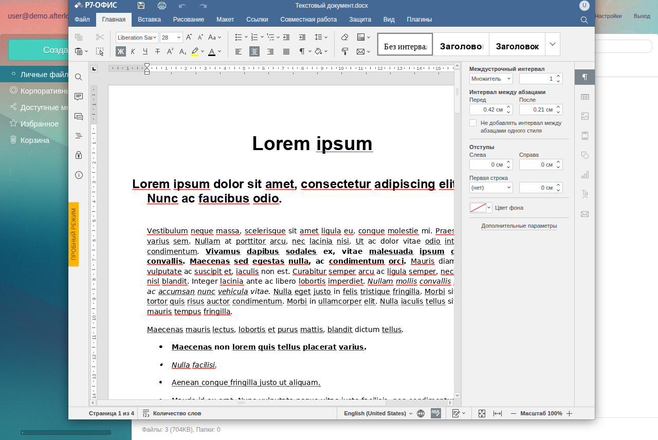 Интеграция с Р7-Офис позволяет редактировать документы, электронные таблицы и презентации. Доступно редактирование совместно с другими пользователями, а также история версий.